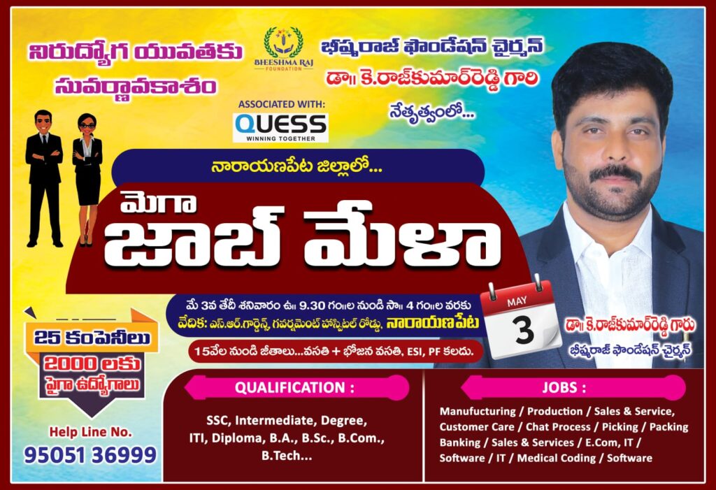 మాన న్యూస్, నారాయణ పేట:– జిల్లాలో ఉన్న నిరుద్యోగ యువతీ యువకులకు ఉద్యోగ, ఉపాధి అవకాశాలు కల్పించేందుకు భీష్మరాజ్ ఫౌండేషన్ ఎనలేని కృషి చేస్తుందని భీష్మరాజ్ ఫౌండేషన్ చైర్మన్ డాక్టర్ కే.రాజ్ కుమార్ రెడ్డి తెలిపారు. ఈ సందర్భంగా ఆయన మాట్లాడుతూ,భీష్మరాజ్ ఫౌండేషన్ ఆధ్వర్యంలో నారాయణపేట కూరగాయల మార్కెట్ రోడ్డులో ఉన్న ఎస్.ఆర్.గార్డెన్స్ లో మే 3వ తేదీ శనివారం ఉదయం 9.30 గంటల నుండి సాయంత్రం 4 గంటల వరకు మెగా జాబ్ మేళాను నిర్వహిస్తున్నమని తెలిపారు. భీష్మరాజ్ ఫౌండేషన్ ఆధ్వర్యంలో నిర్వహించే మెగా జాబ్ మేళాకు సంబంధించిన పోస్టర్ ను నారాయణపేటలో ఫౌండేషన్ సభ్యులతో కలిసి రాజ్ కుమార్ రెడ్డి ఆవిష్కరించారు. నారాయణపేట జిల్లాలో చదువులు పూర్తి చేసి ఉద్యోగాలు, ఉపాధి లేక అనేక మంది యువతీ యువకులు ఇబ్బందులు పడుతున్నారనే విషయాన్ని తెలుసుకుని వారికి ఉద్యోగావకాశాలు కల్పించేందుకు భీష్మరాజ్ ఫౌండేషన్ ఆధ్వర్యంలో ఈ మెగా జాబ్ మేళాను ఏర్పాటు చేసినట్లు పేర్కొన్నారు. ఈ జాబ్ మేళాలో సుమారు 25 ప్రముఖ ఎం.ఎన్.సీ కంపెనీలు పాల్గొంటాయని తెలిపారు. నారాయణపేట జిల్లాలో ఉన్న యువతకు ఉద్యోగ, ఉపాధి అవకాశాలు కల్పించడమే లక్ష్యంగా పని చేస్తున్నామని అన్నారు. నిరుద్యోగ యువతీ యువకులు ఈ మెగా జాబ్ మేళాను ఉపయోగించుకోవాలని రాజ్ కుమార్ రెడ్డి సూచించారు. ఈ కార్యక్రమంలో ఫౌండేషన్ సభ్యులు గడ్డం తిప్పన్న, పోలీసు పటేల్ మధుసూదన్ రెడ్డి, సుదర్శన్ రెడ్డి, గోపాల్ గౌడ్, రుద్రారెడ్డి, హనుమంతు, వై.సంతోష్, శివరాజ్, ఎం.సంతోష్, నరేష్ గౌడ్, ప్రవీణ్, విజయ్, రాజు తదితరులు పాల్గొన్నారు.