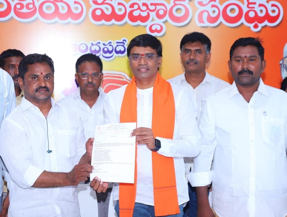 మన న్యూస్ తిరుపతి :– జిల్లాలో కార్మికుల సంక్షేమం, వారి అభివృద్ధి, బలోపేతం చేయడమే భారతీయ మజ్దూర్ సాంగ్ లక్ష్యమని బి ఎం ఎస్ జిల్లా అధ్యక్షులు ఆకుల సతీష్ కుమార్ తెలిపారు. బుధవారం గాంధీ రోడ్డు లోని ఏ జీకే బిల్డింగ్ లో ఆకుల సతీష్ కుమార్ ఆధ్వర్యంలో జిల్లా నూతన కార్యవర్గ సభ్యులకు రాష్ట్ర కార్యదర్శి శీనప్ప చేతుల మీదుగా నియామక పత్రాలను అందజేశారు. అనంతరం బి ఎం ఎస్ జిల్లా అధ్యక్షులు ఆకుల సతీష్ కుమార్ మీడియాతో మాట్లాడుతూ దేశవ్యాప్తంగా బిఎంఎస్ రెండు కోట్ల 50 లక్షల సభ్యత్వం కలిగిన ట్రేడింగ్ అని చెప్పారు. ఎటువంటి రాజకీయ పార్టీలకు బి ఎం ఎస్ ట్రేడింగ్ యూనియన్ కు ఎలాంటి అనుసంధానం లేదని పేర్కొన్నారు. దేశంలో కోట్లాదిమంది సభ్యత్వం కలిగిన అతిపెద్ద ట్రేడ్ యూనియన్ అని చెప్పారు. వివిధ కేంద్ర, రాష్ట్ర ప్రభుత్వ కార్యాలయాలలో ఉన్న 5వేలకు పైగా యూనియన్లు బిఎంఎస్ గొడుగు కింద పని చేస్తున్నాయన్నారు. 1989లో అప్పటి కేంద్ర ప్రభుత్వమే దేశంలో కోట్లాది మందితో సభ్యత్వం కలిగిన ఏకైక ట్రేడ్ యూనియన్ బిఎమ్ఎస్ అని ఆనాడే చెప్పడం జరిగిందన్నారు. సంస్థలలో, కార్పొరేట్ కంపెనీలలో, ఫ్యాక్టరీలలో పనిచేసే కార్మికులకు యాజమాన్యం కు ఎటువంటి ఒడిదుడుకులు లేకుండా సమన్యాయంగా పనిచేసేదే బిఎంఎస్ అని చెప్పారు. ఉత్తరాది రాష్ట్రాలలో భారతీయ మజ్దూర్ సంఘ్ నేతృత్వంలోనే డ్వాక్రా సంఘాలు నడుస్తున్నాయన్నారు. ముఖ్యంగా పంజాబ్, హర్యానా, రాజస్థాన్, గుజరాత్ లతోపాటు మిగిలిన ఉత్తరాది రాష్ట్రాలలో కార్మికులకు అండగా నిలిచేది బి ఎం ఎస్ అని తెలిపారు. కేంద్ర ప్రభుత్వ ఆధీనంలో నడుస్తున్న రైల్వే, పోస్టల్, బిఎస్ఎన్ఎల్ లతోపాటు మరికొన్ని కేంద్ర ప్రభుత్వ శాఖలలో బి ఎం ఎస్ కార్మికులే అత్యధికంగా ఉన్నారని చెప్పారు. మరో6 నెలల్లో జిల్లాలో 1500 కు సభ్యత్వాన్ని పెంచుతాం… తిరుపతి జిల్లా అధ్యక్షులుగా తాను బాధ్యతలు చేపట్టిన నాటినుండి వచ్చే ఆరు నెలల్లోగా 1500 సభ్యత్వం చేసి తీరుతామని శపధం చేశారు. ఇప్పటివరకు జిల్లాలో 575 మంది మాత్రమే సభ్యులు ఉన్నారని, ఆ సంఖ్యను మూడు రెట్లు ఎక్కువ చేస్తామన్నారు. జిల్లావ్యాప్తంగా ఉన్న అన్ని కార్పొరేట్ సంస్థలతో పాటు ఫ్యాక్టరీలలో పనిచేస్తున్న కార్మికులను కలసి యూనియన్ నూతన కార్యవర్గాలను ఏర్పాటు చేస్తామని చెప్పారు. ఏది ఏమైనా ఎలాంటి రాజకీయ పార్టీలకు అనుసంధానంగా లేకుండా పనిచేసే ఏకైక కార్మిక యూనియన్ భారతీయ మజ్దూర్ సంఘ్ ఒకటేనని ఆకుల సతీష్ కుమార్ తెలిపారు. జిల్లా అధ్యక్షులుగా ఎన్నికైన ఆకుల సతీష్ కుమార్ ను జిల్లాలోని పలువురు ప్రజా ప్రతినిధులు, అధికారులు, సన్నిహితులు స్నేహితులు శుభాకాంక్షలతో ముంచేత్తారు. నూతన కార్యవర్గం ఇదే… జిల్లా అధ్యక్షులు.. ఆకుల సతీష్ కుమార్ ,ఉపాధ్యక్