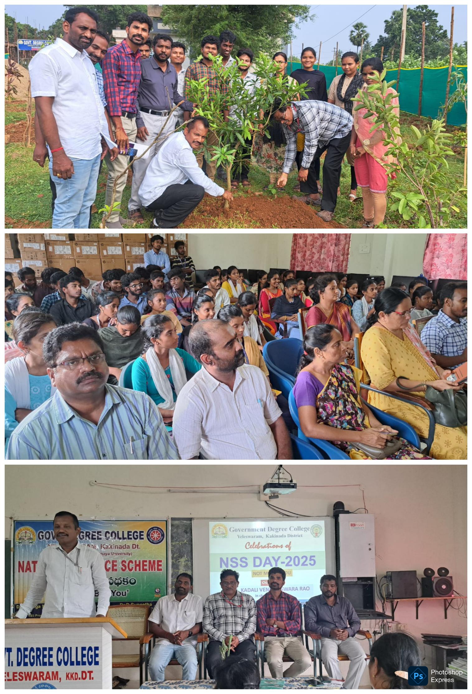ఏలేశ్వరం ప్రభుత్వ డిగ్రీ కళాశాల జాతీయ సేవా పథకం ప్రోగ్రాం అధికారి డా. ప్రయాగ మూర్తి ప్రగడ అద్వర్యంలో జాతీయ సేవా పథకం ఆవిర్భావ దినోత్సవంను ఘనంగా నిర్వహించారు. ఈ కార్యక్రమానికి ముఖ్య అధితిగా ఇన్ఛార్జ్ ప్రిన్సిపాల్ కే. వెంకటేశ్వరరావు హాజరై బొటానికల్ గార్డెన్ లో మొక్కలు నాటారు. అలాగే విద్యార్దులకు, విద్యార్ది దశ నుండే సేవ భావం కలిగి ఉండాలని, సేవ చేసే కుతూహలం ఉన్నవారికి జాతీయ సేవా పథకం ఒక మంచి అవకాసమని , కళాశాలలో చవివేటప్పుడు సేవా భావం ఏర్పడితే అది జీవితాంతం ఉంటుందని పది మందికి మంచిచేసే ఆలోచన ఏర్పడుతుందని తెలియజేసారు. కళాశాలను పరిశుభ్రంగా వుంచటం- తోటలు పెంచటం- రోడ్లు వెయ్యటం, పరిసర గ్రామాలను దత్తత తీసుకొని ఆ గ్రామంలో రోడ్లు వేయటం, మురికి వాడలను శుభ్రపరచడం, నిరక్షరాస్యులకి విద్య బోధించడం. ఆరోగ్య సూత్రాలను, వయోజన విద్య ఆవశ్యకతను, జనాభా సమస్య నివారణను ప్రజలకు తెలియజేయడం. వరదలు వచ్చినప్పుడు, అగ్ని ప్రమదాలలోనూ సహాయం చేయడం. ధనవంతుల నుండి విరాళాలు సేకరించి బీదవారికి, అనాథలకు సహాయపడటం. పొదుపు ఆవస్యకతను, అంటు వ్యాధుల వల్ల వచ్చే అరిష్టాలను అరికట్టే విధానాలను ప్రచారం చేయడం వంటి కార్య క్రమాలలో పాల్గొనాలని సూచించారు. ఎస్. ఎస్. పి.ఓ డా. ప్రయాగ మూర్తి ప్రగడ మాట్లాడుతూ ఒక మనిషి మరొక మనిషికి సహకరించడం మానవతా లక్షణంఅన్నారు. అలాగే మనం పదిమందిలో ఉన్నప్పుడు మనవల్ల ఆ పదిమందికీ ప్రయోజనం కల్పించేందుకు కృషి చేయాలి అన్నారు . పరస్పర సహకారంగా, పరోపకారంగా, మంచిగా మెలగటమే సంఘసేవ అని ఎన్. ఎస్. ఎస్ లో ఉంటె మంచి మానవత విలువలు కలిగిన వ్యక్తులుగా ఎదుకుతారని, 1969 సెప్టెంబరు 24న అప్పటి కేంద్ర విద్యాశాఖ మంత్రి డాక్టర్ వి.కె.ఆర్.వి.రావు 37 విశ్వవిద్యాలయాలలో జాతీయ సేవా పథకం (ఎన్.ఎస్.ఎస్) కార్యక్రమాన్ని మహాత్మ గాంధి శతజయంతి సందర్భంగా ప్రారంభించడం జరిగిందని తెలియజేశారు. కళాశాల వాలంటీర్లు అనేక సేవ కార్యక్రమాల తో పాటు అవగాహన కార్యక్రమాలు ద్వారా సమాజ సేవ చేస్తున్నారని, వాలంటీర్లకు అభినందనలు తెలియసేశారు 2024-2025 విద్యా సంవత్సరంలో 38 కార్యక్రమాలు చేశామని తెలిపారు. కార్యక్రమంలో అధ్యాపకులు కె సురేశ్ , డా. మదీనా, డా. శివ ప్రసాద్, శ్రీలక్ష్మి, వీరభద్ర రావు, డా. బంగార్రాజు, సతీశ్, మేరీ రోజలీనా, పుష్పా, రాజేష్ మరియు అధ్యాపకేత సిబ్బంది సత్యనారాయణ , ధర్మ రాజు , దివ్య,రామలక్ష్మి కమల, కళావతి , పెద్ద సంఖ్యలో విద్యార్దిని విద్యార్దులు తదితరులు పాల్గొన్నారు.