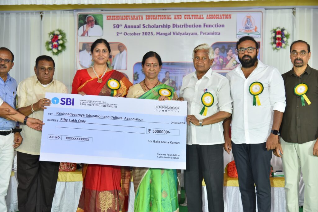 చిత్తూరు జిల్లా పూతలపట్టు మండలం మంగళ్ విద్యాలయం, పేటమిట్ట గ్రామమునందు 50వ శ్రీకృష్ణదేవరాయ విద్యా సాంస్కృతిక సంఘ వార్షికోత్సవం ఘనంగా జరిగింది. గ్రామీణ ప్రాంతంలో ప్రతిభ కలిగిన ఎంతోమంది పేద విద్యార్థులు ఆర్థిక ఇబ్బందులు పడుతున్న నేపథ్యంలో తమ వంతు సహాయ సహకారాలు అందించాలనే నెపంతో కీర్తి శేషులు పాటూరి రాజగోపాల్ నాయుడు స్ఫూర్తితో డాక్టర్ రామచంద్ర నాయుడు గల్లా , శ్రీకృష్ణదేవరాయ విద్యాసాంస్కృతిక సంఘాన్ని స్థాపించి, అందులో ఎంతో మంది దాతలను భాగస్వాములుగా చేసి, పదవ తరగతిలో ప్రతిభ కనపరచిన విద్యార్థులకు మరియు ఇంటర్, డిగ్రీ , బీటెక్, సిఏ మొదలైన కోర్సుల్లో ప్రతిభ కనపరచిన 250 మంది విద్యార్థినీ విద్యార్థులకు 50 లక్షల రూపాయలు ఉపకార వేతనాలను అందించారు . గౌరవనీయులు గల్లా అరుణ కుమారి మాట్లాడుతూ ఇటీవల తాను రాసిన స్వీయ చరిత్ర పుస్తక ఆవిష్కరణ జరిగింది. ఆ పుస్తకం మొదటి ముద్రణలోని 5000 పుస్తకాలు అమ్ముడయ్యాయి. ఆ పుస్తకాల ద్వారా వచ్చిన నగదును గత సంవత్సరము అక్షరాల 50 లక్షల రూపాయలు, ఈ ఏడాది 50 లక్షల రూపాయలు మొత్తం కలిపి కోటి రూపాయలు పేద విద్యార్థుల చదువుకు ఉపయోగపడాలనే సదుద్దేశంతో ఆ మొత్తాన్ని ట్రస్టుకు విరాళంగా అందించడానికి చాలా సంతోషపడుతున్నామని అదేవిధంగా ఇది నా డబ్బు కాదు, పదివేల మంది చేతుల ద్వారా విరాళంగా అందించారు మరియు ఈ సంస్థ ద్వారా లబ్ధి పొందుతున్న విద్యార్థులు అందరూ కూడా ఉన్నత శిఖరాలకు అధిరోహించాలని దీవిస్తున్నాని తెలియజేశారు. ఈ సందర్భంగా అమర రాజా సంస్థల అధినేత రామచంద్ర నాయుడు గల్లా మాట్లాడుతూ గ్రామీణ విద్యార్థుల అభ్యున్నతే ధ్యేయంగా 1968లో 1000 రూపాయల పెట్టుబడితో ఈ ట్రస్ట్ ను స్థాపించగా నేడు 10 కోట్లు దాటింది. విద్యార్థులు భవిష్యత్తులో స్థిరపడి ఈ సంస్థకు మరింత చేయూతనిస్తే మరి కొంతమందికి సహాయం చేయవచ్చని సూచించారు. ఈ ట్రస్ట్ కు విరాళాలు అందజేస్తున్న దాతలకు కృతజ్ఞతలు తెలిపారు. శ్రీ కృష్ణ దేవరాయ విద్యా సాంస్కృతిక సంఘ అధ్యక్షురాలు అయిన డాక్టర్ గౌరినేని రమాదేవి మాట్లాడుతూ లబ్ధి పొందిన విద్యార్థులందరూ చక్కగా చదువుకుని భవిష్యత్తులో ఉన్నత స్థాయికి ఎదగాలని ఆశిస్తున్నానని అన్నారు.ఈ కార్యక్రమానికి ముఖ్యఅతిథులుగా విచ్చేసినటువంటి గౌరవనీయులు సరస్వతీపుత్ర బిరుదాంకితులు, టి.టి.డి అన్నమాచార్య ప్రాజెక్టు డైరెక్టర్ డా.మేడసాని మోహన్ , మాట్లాడుతూ వేలాదిమంది నిరుద్యోగ యువతకు ఉపాధి కల్పించి ఆదుకుంటున్న గల్లా కుటుంబాన్ని ముందుగా అభినందించారు. ఈ సంస్థకు విరాళాలు ఇచ్చి తమ దాతృత్వాన్ని దాటుతున్న వారందరినీ అభినందించారు విద్యార్థులు బాగా చదువుకుని ఉన్నత శిఖరాలను అధిరోహించాలని ఆశీర్వదించారు.అలాగే ప్రణీత్ పెనుమాడు డైరెక్టర్ ఆప్ 