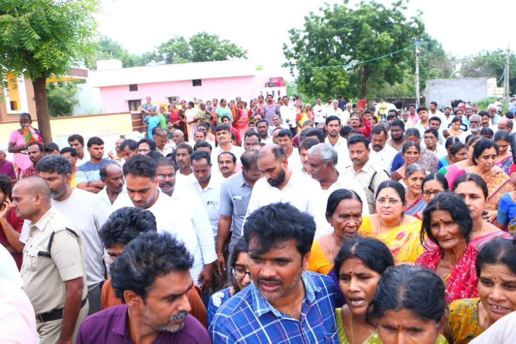 దేవుడు ఎక్కడున్నాడో చెప్పండి అయ్యా.. నా బంగారు తమ్ముణ్ణి, నా కూతురు మనవడు, మనమరాల్ని బ్రతికించమని వేడుకుంటానని, ధనమ్మ ఎమ్మెల్యే కాకర్ల సురేష్ ని పట్టుకొని బోరున విలపించారు. కర్నూలు బస్సు ప్రమాదంలో అగ్నికి ఆహుతైన మృతదేహాలు గోళ్ల వారిపల్లెకు చేరుకునే క్రమంలో ఆదివారం రాత్రి ఎమ్మెల్యే వారి నివాసానికి చేరుకున్నారు. కుటుంబ సభ్యులు జరిగిన పరిణామాలను వివరిస్తూ బోరున విలపించారు. వారిని ఓదార్చడం ఎవరి తరం కాలేదు. గోళ్ల వారిపల్లె గ్రామం శోకసముద్రంలో మునిగిపోయింది. గ్రామానికి పార్థివ దేహాలు చేరుకోవడంతో ఆర్ధనాధాలు మిన్నంటాయి. ఎమ్మెల్యే కాకర్ల సురేష్ అంత్యక్రియల ఏర్పాట్లకు అన్ని సిద్ధం చేసుకోవాలని, దానికి అవసరమైన ఖర్చులు మొత్తం నేనే భరిస్తానని, స్థానిక నాయకులతో తెలిపి, ఏర్పాట్లను సిద్ధం చేయించారు. బాధిత కుటుంబానికి అండగా నిలిచి కుటుంబ పెద్దగా అన్నీ తానై ఎమ్మెల్యే చూసుకుంటున్నారు. ఇటువంటి క్లిష్ట పరిస్థితుల్లో ఎమ్మెల్యే దాతృత్వం మరువరానిదని, చుట్టపు చూపుగా కాకుండా, ప్రేమ అభిమానాలు చూపుతూ, బాధలో కుటుంబానికి అండగా నిలిచిన తీరుపై రాష్ట్రవ్యాప్తంగా ప్రశంసిస్తున్నారు. సోమవారం ఉదయం 8 గంటలకు అంత్యక్రియలు చేసేందుకు ఏర్పాట్లు చేసినట్లు తెలిపారు.ఈ కార్యక్రమం లో ఎమ్మెల్యే వెంట మండల కన్వీనర్ గూడా నర్సారెడ్డి, మాజీ సొసైటీ చైర్మన్ జూపల్లి రాజారావు, చాకలి కొండ మరియు గోళ్ల వారిపల్లె నాయకులు బంధు మిత్రులు తదితరులు ఉన్నారు.