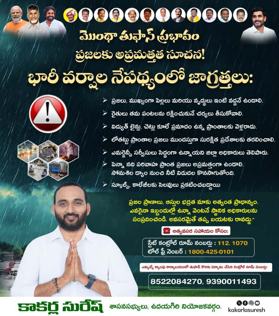 మొంథా తుఫాన్ ప్రభావం నేపథ్యంలో అధికారులు, ప్రజలు అత్యంత అప్రమత్తంగా ఉండాలని ఉదయగిరి నియోజకవర్గ శాసనసభ్యులు శ్రీ కాకర్ల సురేష్ గారు సూచించారు.తుపాన్ తీవ్రత ఎక్కువగా ఉండే అవకాశం ఉన్నందున నియోజకవర్గంలోని ప్రతి శాఖాధికారులు తమ పరిధిలో ముందస్తు చర్యలు తీసుకోవాలని స్పష్టమైన ఆదేశాలు జారీ చేశారు.“ఈ తుపాన్ సమయంలో గంటకు 100 కి.మీ. వేగంతో ఈదురుగాలులు వీసే అవకాశం ఉంది. ప్రజలు అత్యంత జాగ్రత్తగా ఉండాలి. ప్రభుత్వం ఏ పరిస్థితినైనా ఎదుర్కొనేందుకు పూర్తిగా సిద్ధంగా ఉంది. అవసరమైతే పునరావాస కేంద్రాలు సిద్ధంగా ఉన్నాయి — ప్రజలను ముందుగానే అక్కడకు సురక్షితంగా తరలించాలి.”ప్రజలను అధికారులతో సమన్వయంతో వ్యవహరించాలని, ఎక్కడికక్కడ అప్రమత్తంగా ఉండాలని సూచించారు ఎమ్మెల్యే కాకర్ల సురేష్ తెలిపారు.”⚠️ ప్రజలకు సూచనలు:🔴మత్స్యకారులు చేపల వేటకు వెళ్లకుండా జాగ్రత్తపడాలి.🔴తుపాన్ సమయంలో పశువులను సురక్షిత ప్రదేశాలకు తరలించి కాపాడుకోవాలి.🔴విద్యుత్, నీటి, ఆహార సరఫరా వంటి సేవల్లో అంతరాయం రాకుండా అధికార యంత్రాంగం నిరంతరం పర్యవేక్షణ చేయాలి.