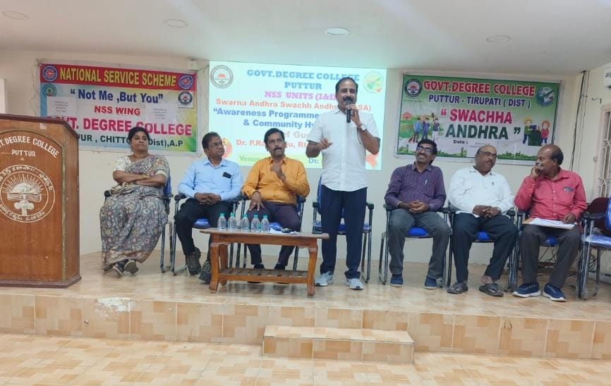పుత్తూరు, మన ధ్యాస: సమాజంలో అధికశాతం జబ్బులు కేవలం వ్యక్తిగత మరియు పరిసరాల అపరిశుభ్రత వల్లే వస్తాయని డాక్టర్ పి.రవిరాజు అన్నారు. ప్రతినెలా మూడవ శనివారం ఆంధ్రప్రదేశ్ ప్రభుత్వం ఆదేశాల మేరకు *స్వర్ణాంధ్ర స్వచ్ఛంధ్ర* కార్యక్రమాన్ని నిర్వహిస్తున్న విషయం తెలిసిందే. ఈ సందర్భంగా ప్రభుత్వ డిగ్రీ కళాశాల, పుత్తూరులో శనివారం స్వచ్ఛంధ్ర స్వర్ణాంధ్ర కార్యక్రమంలో భాగంగా *వ్యక్తిగత మరియు పరిసరాల పరిశుభ్రత* అనే అంశం పైన కార్యక్రమం జరిగింది. ఈ కార్యక్రమానికి ముఖ్య అతిథిగా విచ్చేసినటువంటి డాక్టర్ పి. రవిరాజు మాట్లాడుతూ మనం పరిశుభ్రంగా ఉండడంతోపాటు ప్రజాస్థలాలను శుభ్రంగా ఉంచడం వల్ల రోగాలు వ్యాప్తిని అరికట్టవచ్చని, అలాగే ప్రజల్లో ఆరోగ్యం పట్ల అవగాహన పెంచడం, కాలుష్యం తగ్గించడం మొదలైన ప్రయోజనాలు ఉన్నాయని అన్నారు. సభాధ్యక్షులు కళాశాల ప్రిన్సిపాల్ డాక్టర్ బి చంద్రమౌళి మాట్లాడుతూ విద్యార్థులు చక్కగా తల వెంట్రుకలను కత్తిరించుకొని, చేతి మరియు కాలిగోళ్లను శుభ్రంగా కత్తిరించుకోవాలని రోజుకు రెండు సార్లు స్నానం చేసి వ్యక్తిగత పరిశుభ్రతను పాటించాలని కోరారు… అనంతరం చేతులను శుభ్రం చేసే విషయంపై విద్యార్థులకు అవగాహన కల్పించారు…. అనంతరం విద్యార్థుల చేత స్వచ్ఛంధ్ర స్వర్ణాంధ్ర ప్రతిజ్ఞ చేయించారు. ఈ కార్యక్రమంలో కళాశాల వైస్ ప్రిన్సిపాల్ డాక్టర్ జి.కోటేశ్వరయ్య, కన్వీనర్ డాక్టర్ వెంకటకృష్ణయ్య, డాక్టర్ పి. సుజన,NSS అధికారులు డాక్టర్ కే.శ్రీనివాసులు, బాబురావు, మరియు డాక్టర్ వసంత్, డాక్టర్ కోటేశ్వరరావు, డాక్టర్ గాయత్రి, డాక్టర్ శ్రీదేవి, డాక్టర్ పి వరలక్ష్మి తదితర అధ్యాపకులు, మరియు కళాశాల విద్యార్థిని విద్యార్థులు, అన్నా గౌరీ మెడికల్ కళాశాల సూపరింటెండెంట్ డాక్టర్ రవి తదితరులు పాల్గొన్నారు…