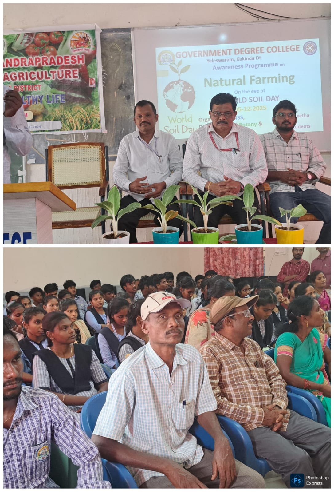 మన ధ్యాస ప్రతినిథి ఏలేశ్వరం: ఏలేశ్వరం ప్రభుత్వ డిగ్రీ కళాశాల నందు మృత్తిక దినోత్సవను పురస్కరించుకొని ఎన్ఎస్ఎస్, వృక్షశాస్త్ర మరియు రసాయన శాస్త్ర విభాగం మరియు ఆంధ్ర ప్రదేశ్ ప్రకృతి వ్యవసాయ ఎన్జిఓ ఏలేశ్వరం మండల విభాగం ఆద్వర్యంలో ప్రకృతి వ్యవసాయం పై అవగాహన కార్యక్రమం ఏర్పాటు చేశారు. ఈ కార్య క్రమానికి కళాశాల వైస్ ప్రిన్సిపల్ కె. వేంకటేశ్వర రావు అద్యక్షత వహించి విద్యార్డులను ఉద్దేశించి మాట్లాడుతు ప్రకృతిలో ఉన్న సహజ విధానాలను ఉపయోగించి రసాయన ఎరువులు, పురుగుమందులు వాడకుండా పంటలను సాగు చేసే విధానం ద్వారా పంటలు పండించడం చాలా అవసరమని, మట్టి ఆరోగ్యం, కాపాడడం మనందరి భాద్యత అని, నేలతల్లి ద్వారా మాత్రమే జీవరాశికి ఆరోగ్యం సంబవిస్తుందని ప్రధానంగా ప్రకృతి వ్యవసాయం ద్వారా సాద్యమాని తెలియజేశారు. డా. ప్రయాగ మూర్తి ప్రగడ మాట్లాడుతూ భారతదేశంలోని ఆంధ్రప్రదేశ్, తెలంగాణ, కర్నాటక, మహారాష్ట్ర రాష్ట్రాల్లో విస్తృతంగా ప్రాకృతిక వ్యవసాయం పెరుగుతోందని . ఆంధ్రప్రదేశ్లో దీనిని ఎపిసిఎన్ఎఫ్ (ఆంధ్రప్రదేశ్ కమ్యూనిటీ సహజ వ్యవసాయం) పేరుతో పెద్ద స్థాయిలో అమలు చేస్తున్నారని, రసాయనిక ఎరువులు వాడకుండా రసాయన ఖర్చులు లేకపోవడంతో ఉత్పత్తి వ్యయం తగ్గుతుందని , మట్టి ఆరోగ్యం మెరుగవుతుందని , పంటల నాణ్యత పెరుగుతుందని , నీటి వినియోగం తగ్గుతుందని , రైతులకు లాభదాయకం, పర్యావరణానికి స్నేహపూర్వకమైన వ్యవస్థ ఆరోగ్యకరమైన ఆహారం జీవ వైవిద్యం లో కొన్ని జీవులు అంతరించకుండా కాపాడగలుగుతామని ప్రతి ఒక్కరినీ ప్రకృతి వ్యవసాయంపై చైతన్య పరచాలని విద్యార్డులకు కోరారు. ఆంధ్ర ప్రదేశ్ ప్రకృతి వ్యవసాయ ఎన్జిఓ ఏలేశ్వరం మండల కోఆర్డినేటర్ మజ్జి నాగేశ్వర రావు మాట్లాడుతూ జీవామృత,ఘన జీవామృతం, నీమ్ పచ్చడి తయారీ ప్రాకృతిక వ్యవసాయ ప్రయోజనాలు మొదలైన అంశాలు తెలియజేశారు. కార్యక్రమంలో అద్యపకులు వి రామ రావు కె. సురేష్. ఎస్కే మదీనా, డా. శివప్రసాద్. వీరభద్ర రావు, శ్రీ లక్ష్మి,డా. కె బంగార్రాజు,మేరి రొసిలిన, పుష్పా , సతీశ్, మరియు అద్యపకేత సిబ్బంది , పెద్ద సంఖ్యలో విద్యార్దిని విద్యార్దులు పాల్గొన్నారు.
