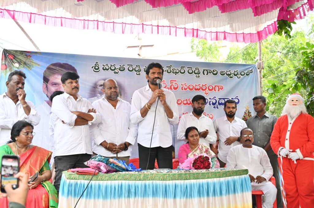మన ధ్యాస, నెల్లూరు, డిసెంబర్ 19: నెల్లూరు నగరంలోని 51 డివిజన్ కపాడిపాలెంలో డివిజన్ ఇంచార్జ్ సందీప్, డివిజన్ నేతలు ఉమా , కళ్యాణ్ ఆధ్వర్యంలో జరిగిన సెమీ క్రిస్మస్ వేడుకలకు వైఎస్ఆర్సిపి నెల్లూరు సిటీ ఇన్ చార్జ్ ఎమ్మెల్సీ పర్వతరెడ్డి చంద్రశేఖర్ రెడ్డి ముఖ్యఅతిథిగా హాజరయ్యారు. ఈ సందర్భంగా పర్వత రెడ్డి చంద్రశేఖర్ రెడ్డి పేద మహిళలకు చీరలు పంపిణీ చేసి అన్నదానం కార్యక్రమం నిర్వహించారు. ఈ సందర్భంగా ఎమ్మెల్సీ పర్వత రెడ్డి చంద్రశేఖర్ రెడ్డి మాట్లాడుతూ……సెమి క్రిస్మస్ వేడుకల్లో పాల్గొని.. పేదలకు వస్త్రాలు పంపిణీ చేసి.. అన్నదాన కార్యక్రమం నిర్వహించడం ఎంతో సంతోషాన్ని ఇచ్చిందన్నారు.క్రిస్మస్ పండుగ అంటేనే.. క్రైస్తవులకు అతి పవిత్రమైనదని.. ఈ పండుగ పరమార్థం సేవేనని అన్నారు. ఈ ప్రాంతంలో ఎక్కువమంది క్రైస్తవులు.. నివసిస్తూ క్రిస్మస్ వేడుకలను.. ప్రతి ఏటా ఎంతో అట్టహాసంగా.. నిర్వహిస్తుండడం.. సంతోషకరమని తెలిపారు. సేవ గుణం కలిగిన క్రైస్తవులు.. తమకు ఉన్న దానిలో కొంత భాగం.. పేదలకు దానం చేయాలనే ఆలోచన ప్రతి ఒక్కరిలో ఉండడం వారి సేవా గుణానికి నిదర్శనం అన్నారు.ప్రతి ఒక్కరూ సేవా గుణాన్ని అలవర్చుకొని.. ఉన్నదానిలో కొంత పరులకు దానం చేసి.. సమాజంలో అందరూ ఒకటే అన్న భావన కలగజేయాలని పిలుపునిచ్చారు. *51, 52 డివిజన్లు వైయస్సార్ కాంగ్రెస్ పార్టీకి కంచుకోట లాంటివని.. ఈ డివిజన్లో ప్రజలు వైఎస్ఆర్ కాంగ్రెస్ పార్టీని, వైయస్ జగన్మోహన్ రెడ్డి గారిని ఎప్పటికీ ఆదరిస్తూనే ఉంటారని తెలిపారు.* మళ్లీ ఈ రాష్ట్రంలో జగన్మోహన్ రెడ్డి గారి ప్రభుత్వం ఏర్పడుతుందని.. అప్పుడు అన్ని వర్గాల ప్రజలకు సమన్యాయం జరుగుతుందని తెలిపారు. ఈ కార్యక్రమంలో 52,11, 9 డివిజన్ ఇన్ చార్జ్ లు మహబూబ్ బాషా, మహేష్ యాదవ్,ధనుజా రెడ్డి, 51వ డివిజన్ కోఆర్డినేటర్ బాల ప్రసాద్, వైసీపీ నేతలు సరిత, ప్రమీల, శాంతి, కరుణ, అన్నమ్మ, సుజాత, సునీల్, రాహుల్, వర ప్రసాద్,రవి, హేమంత్, సునీల్ తదితరులు పాల్గొన్నారు,