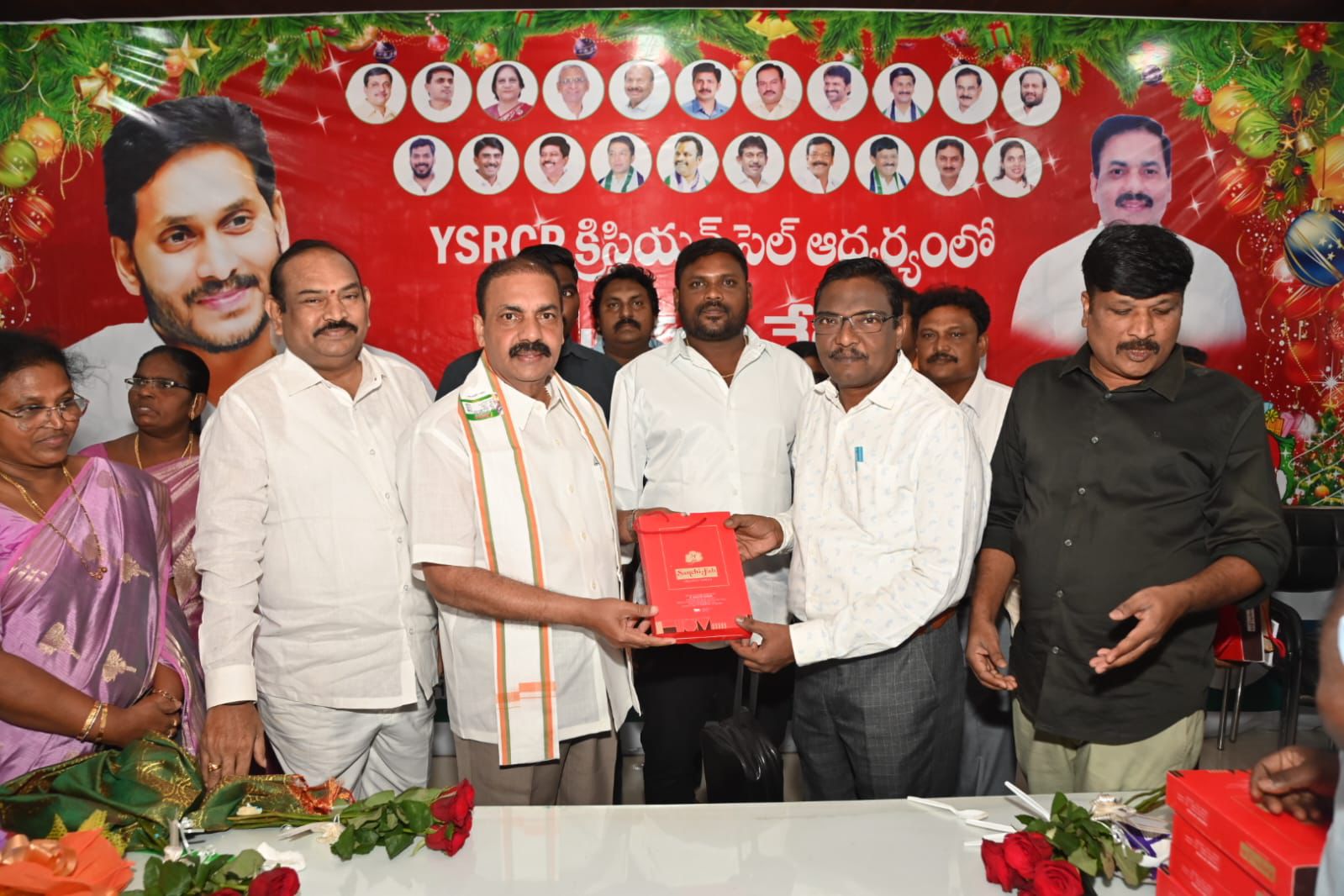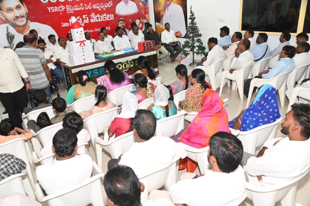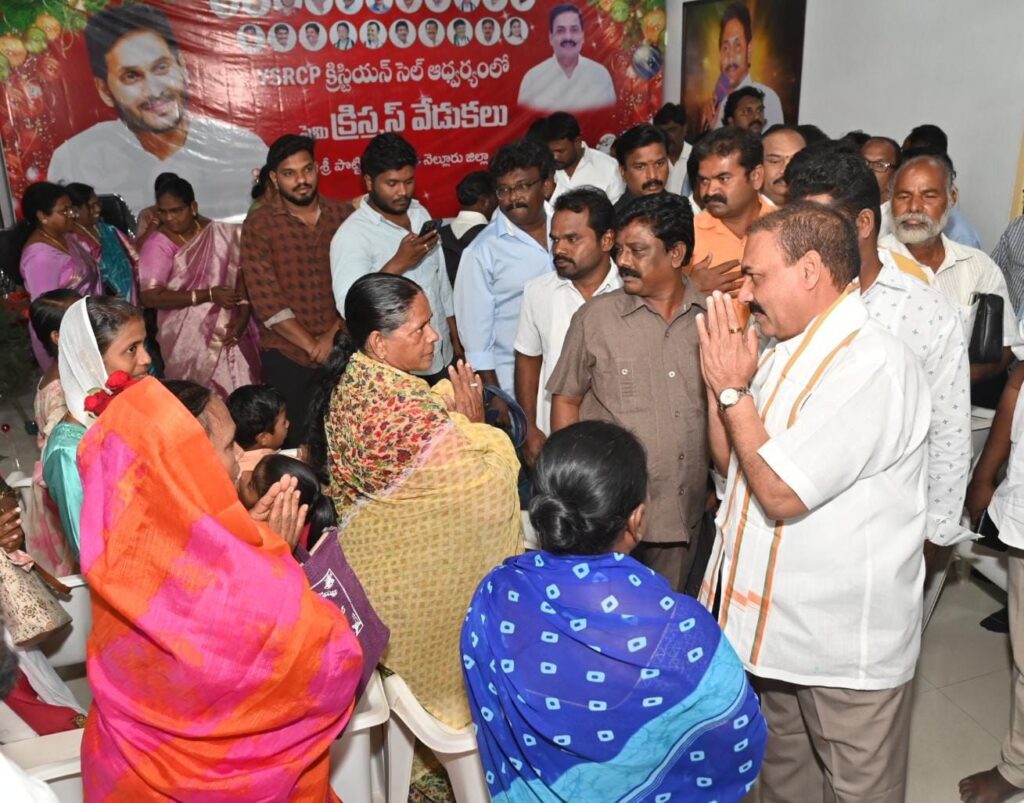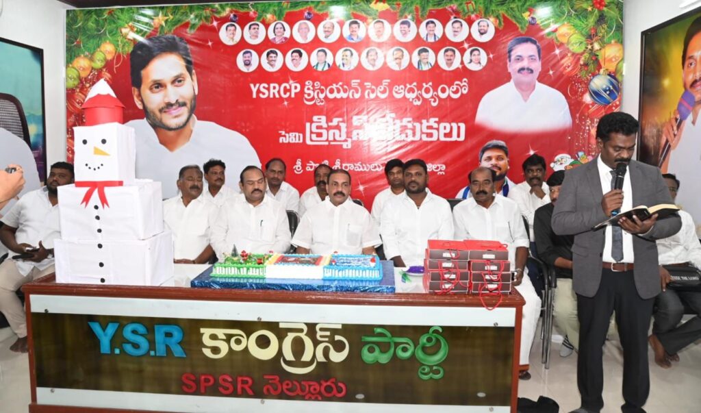 మన ధ్యాస, నెల్లూరు రూరల్,డిసెంబర్ 23:నెల్లూరు జిల్లా వైయస్సార్ కాంగ్రెస్ పార్టీ కార్యాలయంలో మంగళవారం వైయస్సార్ కాంగ్రెస్ పార్టీ జిల్లా క్రిస్టియన్ విభాగం అధ్యక్షులు కాళహస్తి భవన్ అనుదీప్ ఆధ్వర్యంలో నిర్వహించిన సెమి క్రిస్మస్ వేడుకలలో శాసనమండలి సభ్యులు మేరిగ మురళీధర్ , ఇతర నాయకులు, పాస్టర్లతో కలిసి పాల్గొని, కేక్ కట్ చేసి, క్రిస్మస్ శుభాకాంక్షలు తెలియజేసిన మాజీ మంత్రివర్యులు మరియు ఉమ్మడి నెల్లూరు జిల్లా వైయస్సార్ కాంగ్రెస్ పార్టీ అధ్యక్షులు డా౹౹ కాకాణి గోవర్ధన్ రెడ్డి.క్రీస్తు ప్రభువు సందేశాన్ని చదివి వివరించడంతో పాటు, ప్రత్యేక ప్రార్థనలు నిర్వహించిన పాస్టర్లు.ప్రజలందరికీ ముందస్తు క్రిస్మస్ శుభాకాంక్షలు తెలియజేసిన కాకాణి గోవర్ధన్ రెడ్డి. ఈ సందర్భంగా మాజీ మంత్రి కాకాని గోవర్ధన్ రెడ్డి మీడియాతో మాట్లాడుతూ…………ప్రభువు ఏసుక్రీస్తు జననం సందర్బంగా క్రిస్మస్ వేడుకలు ప్రపంచవ్యాప్తంగా అందరూ ఘనంగా జరుపుకునే పండుగ అని అన్నారు.ప్రభువు ఏసుక్రీస్తు చూపించిన శాంతి సందేశం ప్రపంచ మానవాళికి ఆచరణీయం అని అన్నారు.దాదాపు 10 రోజుల ముందు నుండి పండుగ వాతావరణంలో క్రిష్టియన్ సోదరులు జరుపుకుంటున్న ఏసు క్రీస్తు ప్రభువు జన్మదిన వేడుకల్లో పాల్గొన్నడం సంతోషంగా ఉంది అని తెలియజేశారు.ఏసుక్రీస్తు చూపిన మార్గాన్ని అనుసరిస్తూ క్రిస్టియన్ సోదరులు శాంతికపోతాలుగా సమాజంలో వ్యవహరిస్తున్నారు అని అన్నారు.ప్రభువు ఏసుక్రీస్తు జీవితం పక్కవారికి సహాయం చేస్తూ, శాంతి మార్గంలో ఏ విధంగా నడుచుకోవాలో చెబుతుంది అని తెలియజేశారు.నేటి సమాజంలో ప్రభువు చూపించిన శాంతి మార్గాన్ని మానవాళికి చూపించే బాధ్యతను పాస్టర్లు తీసుకోవాలి అని అన్నారు.నేడు సమాజంలో యువత తప్పుదోవ పట్టడంతో, హత్యలు, అత్యాచారాలు పెరిగిపోయాయి అని అన్నారు.ప్రభువు ఏసుక్రీస్తు లాంటి మహనీయుల సందేశాలతో మార్పు తీసుకొనివచ్చి, అందరూ శాంతి మార్గాన్ని అనుసరించేలా పాస్టర్లు కృషి చెయ్యాలి అని తెలియజేశారు.రాజకీయాలలో, కులం, మతం, వ్యక్తిత్వాన్ని సైతం వాడుకుంటున్నారు అని అన్నారు.జగన్మోహన్ రెడ్డి తన మతం మానవత్వమని స్పష్టం చేశారు అని అన్నారు.జగన్మోహన్ రెడ్డి అన్ని వర్గాల ప్రజలకు సంక్షేమ పాలనను అందించి, అందరి మనసుల్లో తనదైన ముద్రను పెనవేసుకున్నారు అని అన్నారు. జగన్మోహన్ రెడ్డి ద్వారా లబ్ధి పొందిన కుటుంబాలు ఊరూరా, వాడవాడలా, ప్రపంచవ్యాప్తంగా పుట్టినరోజు వేడుకలు జరుపుకోవడం అన్ని వర్గాలకు ఆయన చేసిన మేలుకు నిదర్శనం.ప్రభువు ఏసుక్రీస్తు ఆశీస్సులు జగన్మోహన్ రెడ్డిపై ఉండాలని, మీ అందరి ప్రార్థనలతో జగన్మోహన్ రెడ్డి తిరిగి ముఖ్యమంత్రి కావాలని కోరుకుంటూ, క్రిస్టియన్ సోదర, సోదరీమణు