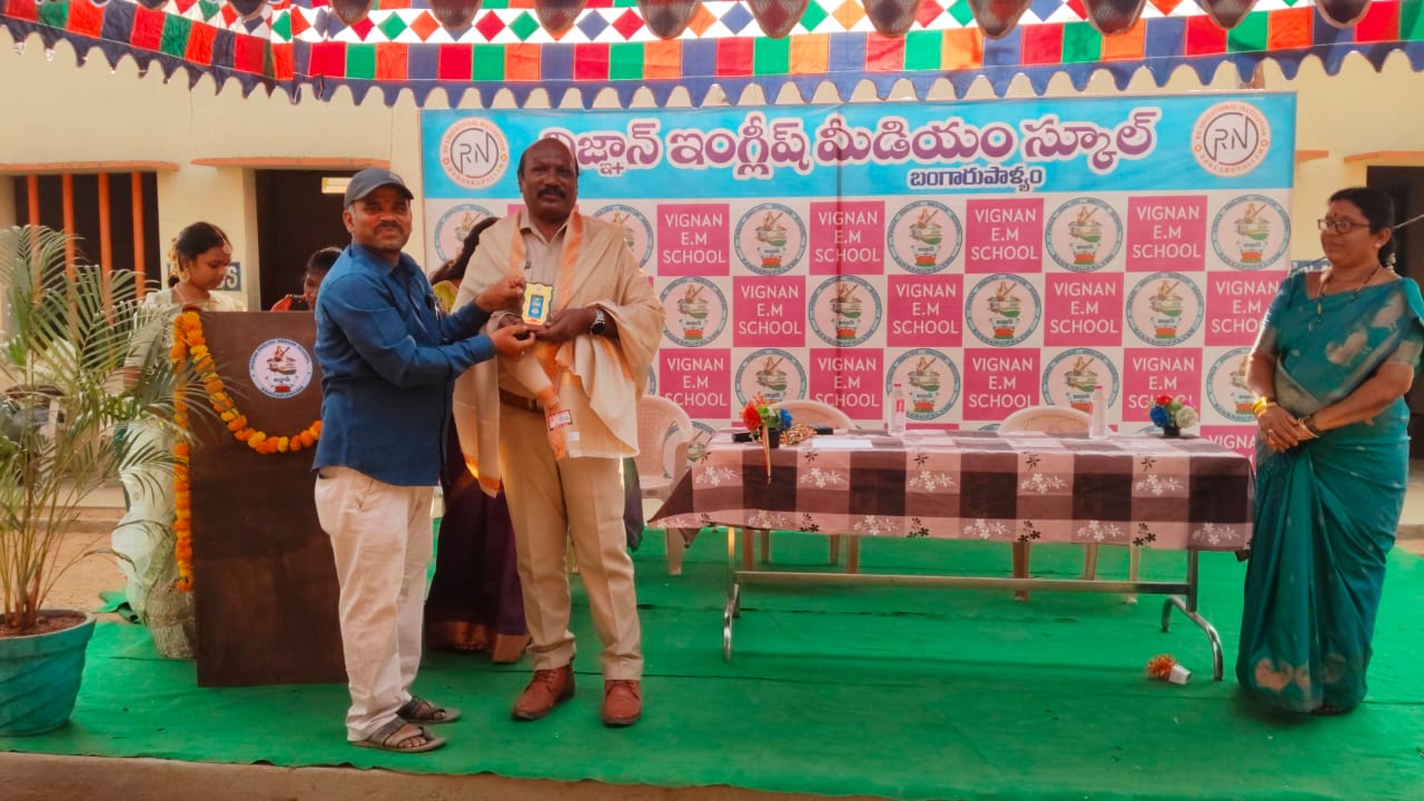బంగారుపాళ్యం మండల కేంద్రంలోని విజ్ఞాన్ ఇంగ్లీష్ మీడియం స్కూల్ 9వ వార్షికోత్సవం గురువారం ఘనంగా నిర్వహించడం జరిగింది. ఈ కార్యక్రమానికి ముఖ్య అతిథి లు గా ఎస్సై ప్రసాద్, బంగారుపాళ్యం సర్పంచ్ ఎం. బి. ఉమాదేవి కృష్ణమూర్తి లు పాల్గొనారు. ఈ సందర్భంగా ఎస్సై ప్రసాద్ మాట్లాడుతూ విద్యార్థి నిలు సమాజంలో వ్యవహరించాల్సిన తీరు పై అవగాహన కల్పించారు. సమాజ సేవ మరియు ఆర్థిక నేరాలు అనే విషయాలను విద్యార్థిని విద్యార్థులకు వివరించారు. విజ్ఞాన్ స్కూల్ కరస్పాండెంట్ ఆర్ఎన్ జ్యోతినాథ్ అతిథులుగా విచ్చేసిన ఎస్ఐ ప్రసాద్ మరియు సర్పంచ్ ఉమాదేవి లను ఘనంగా సన్మానించారు. ఈ కార్యక్రమంలో విజ్ఞాన్ స్కూల్ చైర్మన్ ఆర్ ఎన్ జ్యోతినాథ్, ప్రిన్సిపల్ రాణి, ఇంచార్జ్ హిమగిరి, డైరెక్టర్ రవితేజ మరియు ఉపాధ్యాయులు, విద్యార్థులు , వారి కుటుంబ సభ్యులు పాల్గొన్నారు.